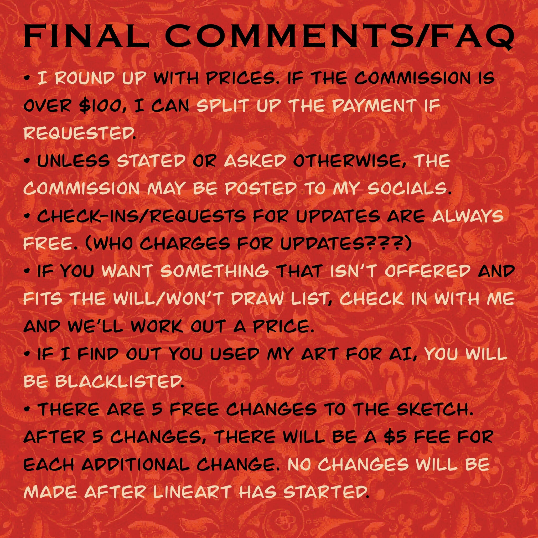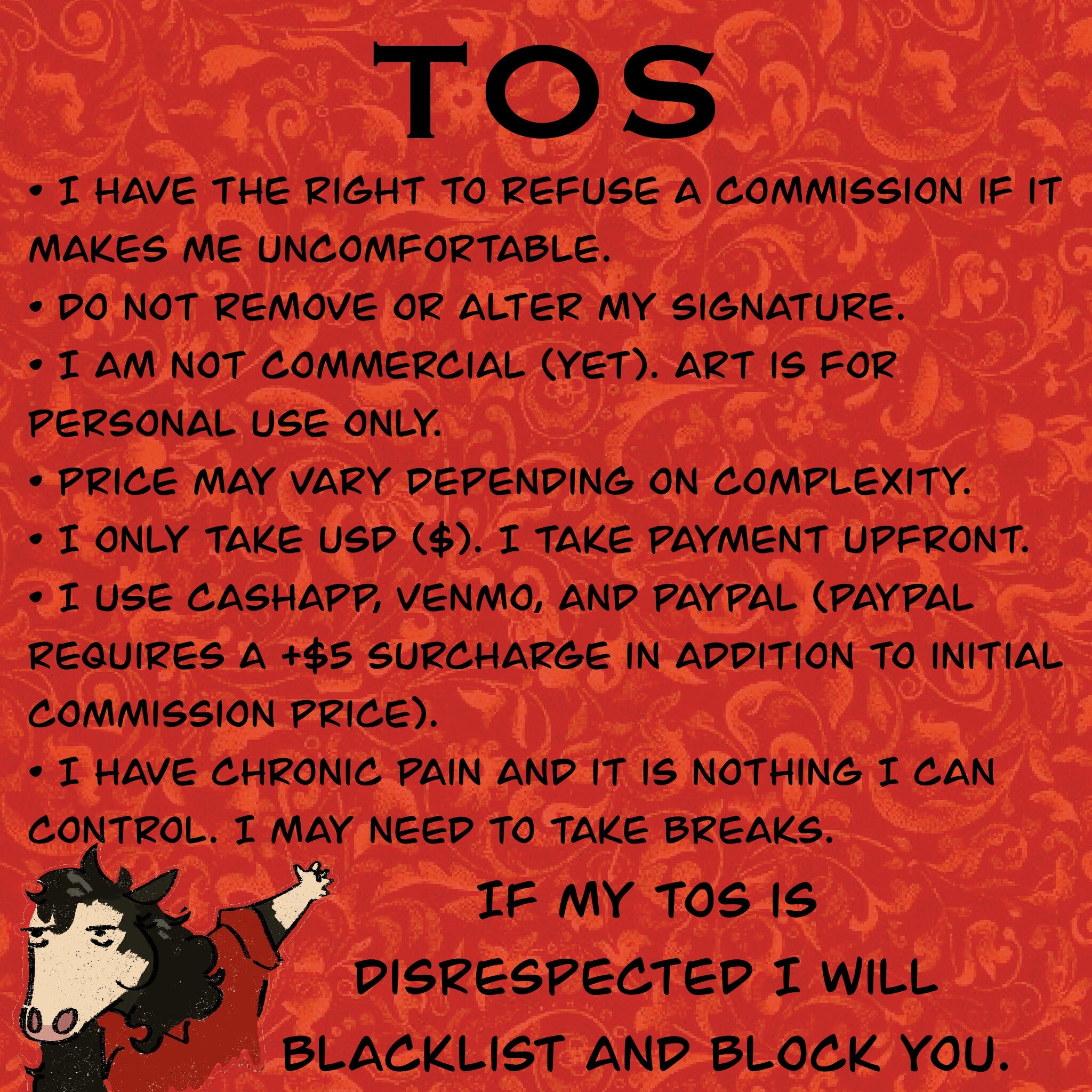 If my TOS and boundaries are crossed, you will be blacklisted from commissioning me further.