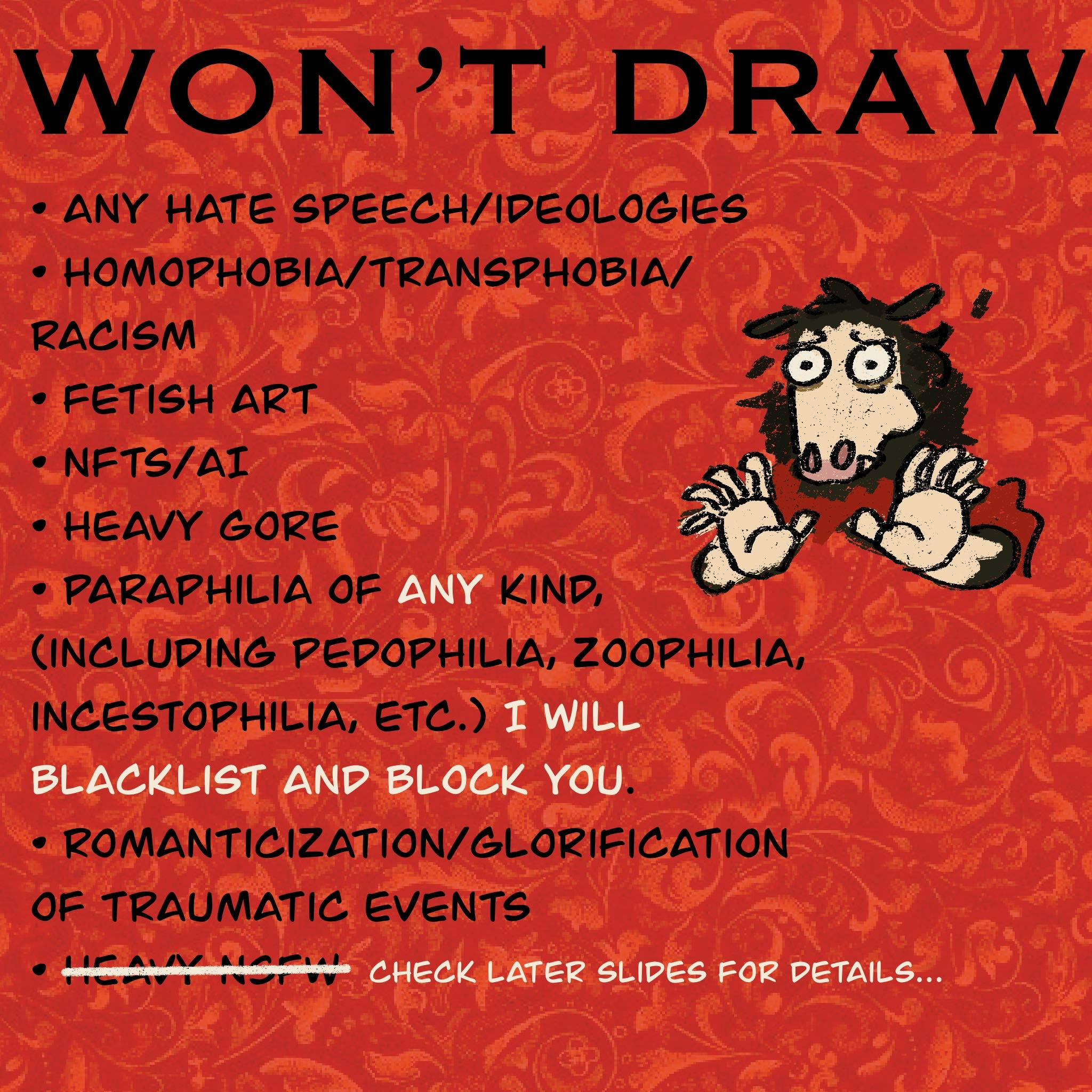 I believe that accessible boundaries are important. If you do not agree with any of these points that I have made, my art in general is not for you. I implore that you rather leave it alone than try to "change my mind" on my boundaries. These are made for my sanity and the safety of people who may find comfort or solace in the community or directly of Bag of Nails.